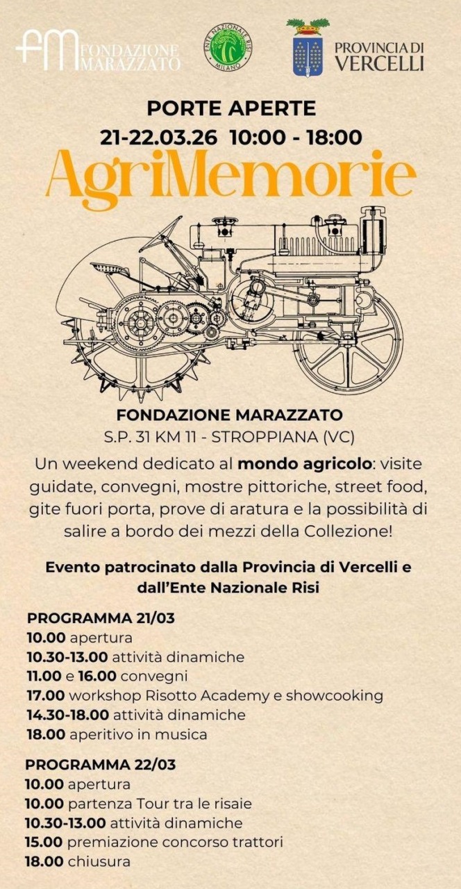 Alla Fondazione Marazzato di Stroppiana tutto è pronto per “Agrimemorie”, due giornate “a porte aperte” nel regno dei mezzi d’epoca che sono stati pensati per rendere omaggio al mondo agricolo.