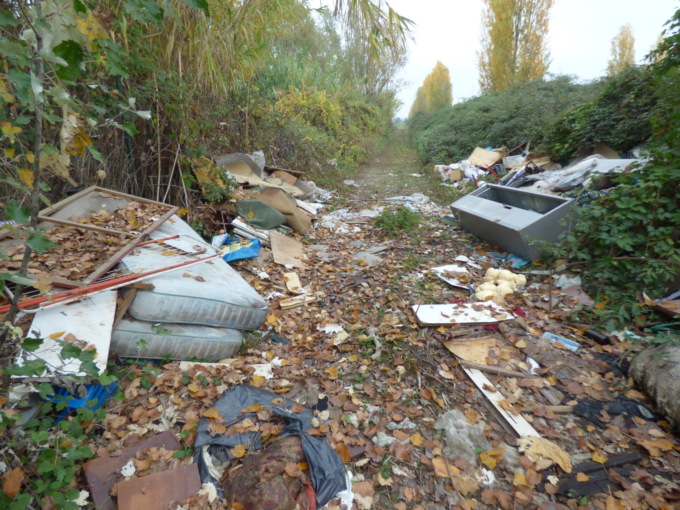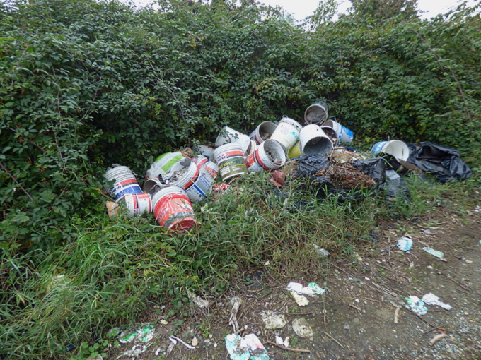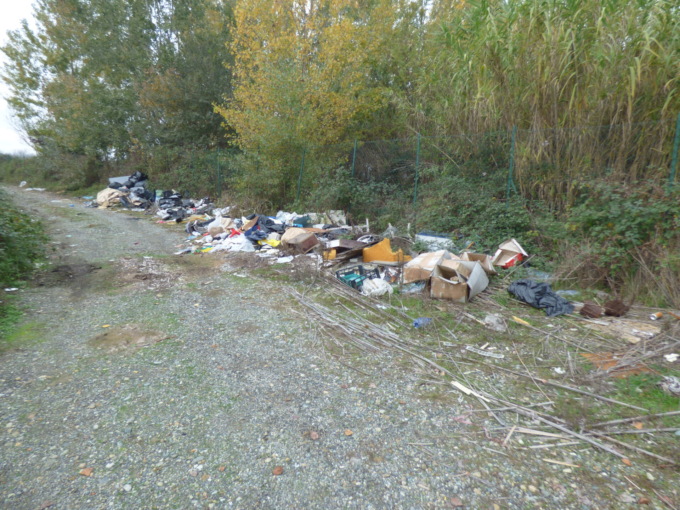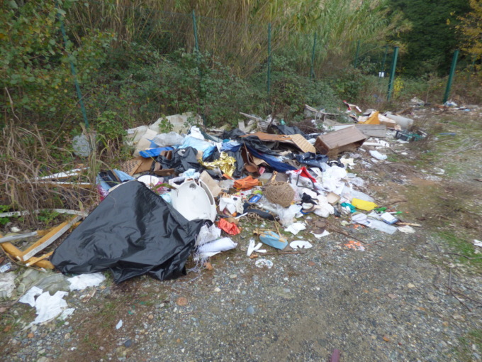 Due i punti, il primo è sul davanti del rudere, su una strada di campagna in disuso, in più mucchi, sacchi neri, secchi interi di rifiuti edilizi, pezzi di mobili e quant’altro.
