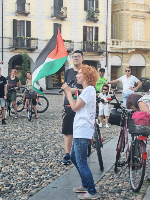 Gli organizzatori della biciclettata hanno definito “vergognosa” la decisione del Comune. Non per nulla la biciclettata, che si è snodata per le vie del centro, da piazza Roma a piazza Cavour (molte le bandiere palestinesi esposte dai partecipanti), è passata sotto la famosa finestra di via Garrone: Elena Pisano non aveva tolto il lenzuolo, ma l’ha arrotolato e, aderendo alla biciclettata, alla quale non ha potuto partecipare direttamente, sabato.