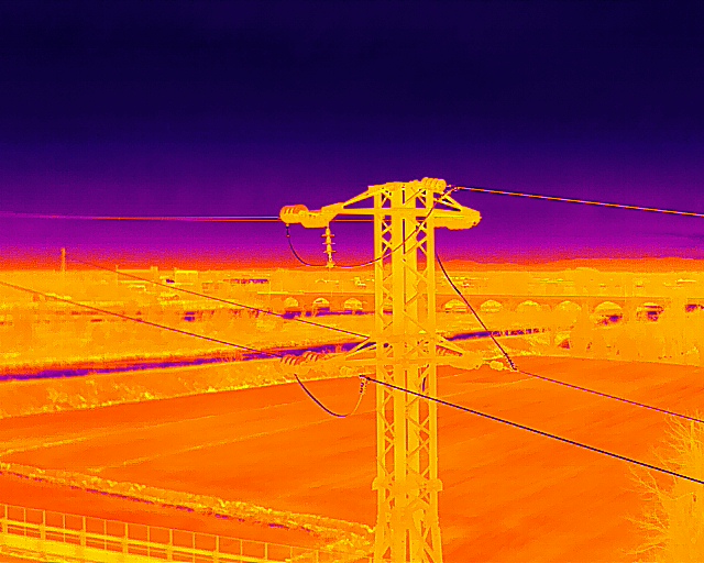 Nella foto lo stesso traliccio ripreso nella modalità termica, che permette di individuare eventuali anomalie.
