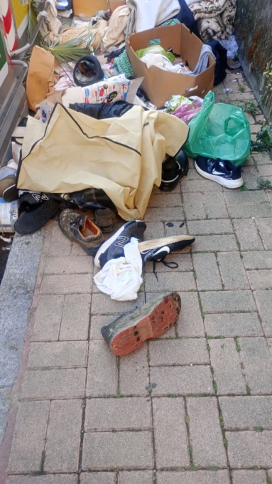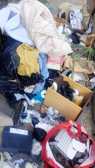 Il clou lo si trova però in una traversa del viale, un po’ più verso il centro città, parliamo di via Benadir quasi all’incrocio col viale, dietro ai cassonetti c’è una montana di tessuti, scarpe, vestiti… Veramente uno scempio.