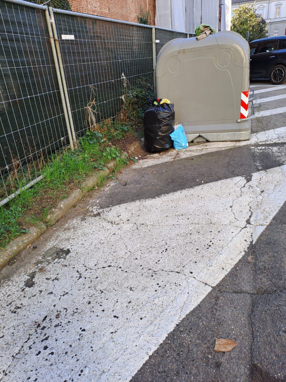La passeggiata (il giorno per la precisione è lunedì 6 ottobre) è proseguita nel pezzo finale di Corso Avogadro, nei pressi del semaforo e di viale Rimemranza, dove ormai da tre settimane c’è un seggiolino da bambino a cui si sono aggiunti vari oggetti, tra cui una borsa piena di libri, neanche in cattivo stato. Ma la carta, pare ovvio, va messa nel cassonetto della carta, se il cassonetto era pieno si riportavano a casa, mica puzzano… i libri andrebbero buttati via solo come estrema ratio, meglio regalarli se possibile.