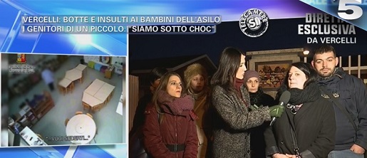 È stato trasmesso poco fa il servizio di Pomeriggio Cinque sul caso dei maltrattamenti nell’asilo di Vercelli. Durante la trasmissione, condotta da Barbara D’Urso, sono stati mostrati alcuni spezzoni dei video registrati dalle telecamere della Polizia.