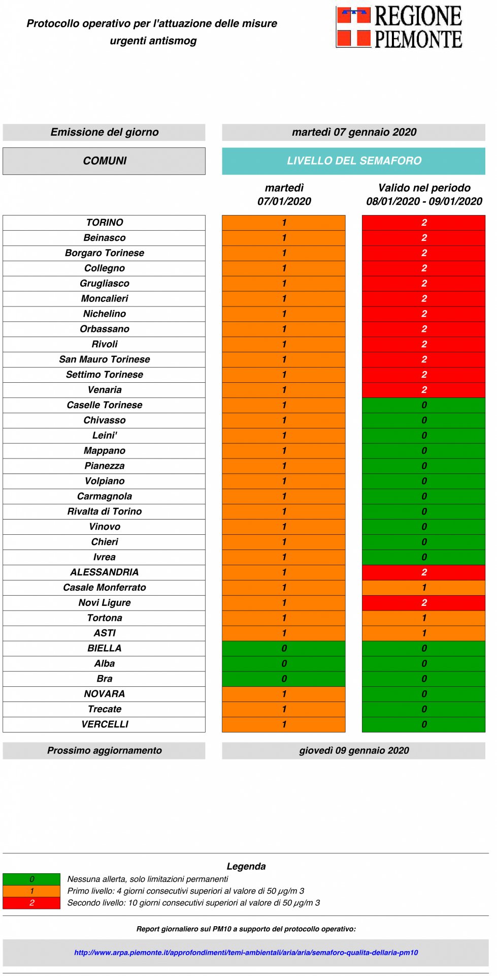 Non risulta necessario prevedere il blocco del traffico nei giorni di mercoledì 8 gennaio e giovedì 9 gennaio 2020 compreso in quanto il semaforo del cruscotto indica il colore verde per la Città di Vercelli.