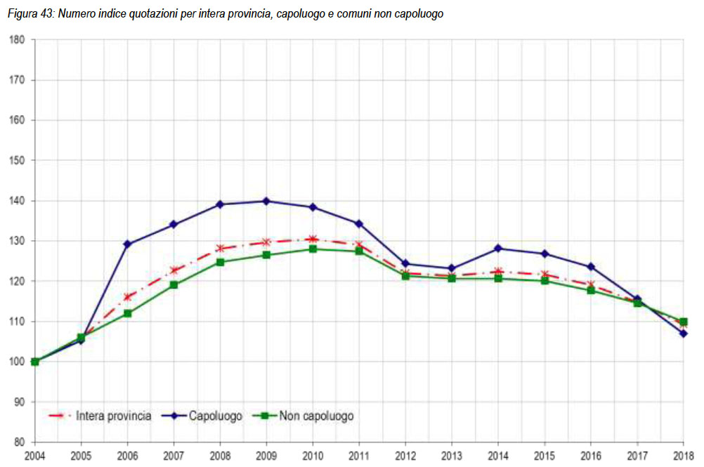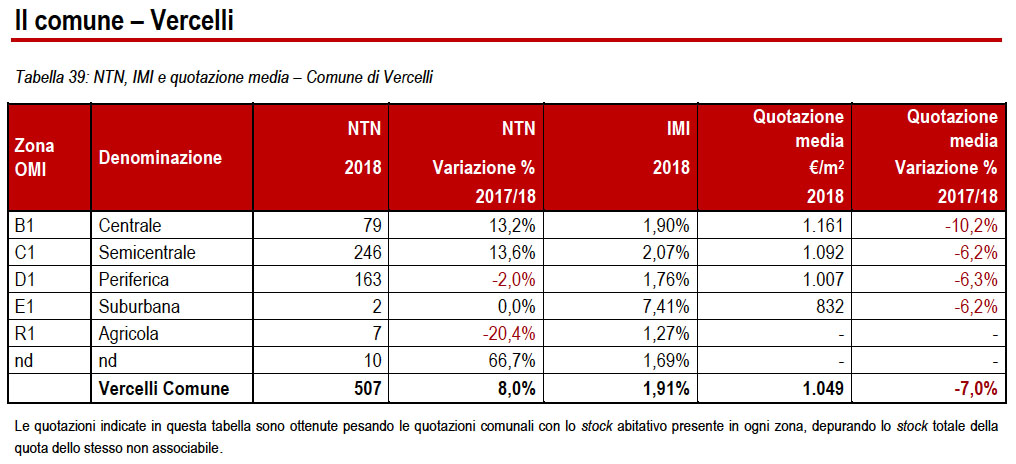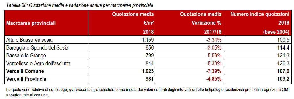 marcato nella zona sud la Bassa e il Vercellese, il picco negativo dei valori riguarda Vercelli capoluogo con un -7,39% rispetto al -6,52% del 2017.