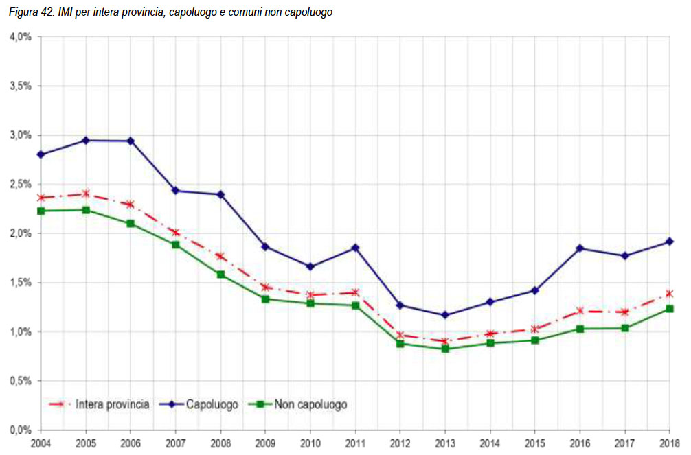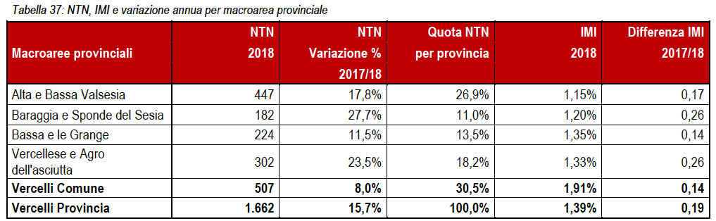 La provincia di Vercelli è stata suddivisa in 5 macroaree compreso il capoluogo (Figura. 40). Il criterio utilizzato per l’individuazione delle macroaree provinciali è l’omogeneità dei territori in base a caratteristiche storiche, culturali, tipologiche e di influenza. La Città di Vercelli costituisce un’unica macroarea urbana suddivisa in 5 zone omogenee. Il mercato immobiliare residenziale mostra per l’anno 2018 in tutta la provincia, un andamento in crescita, con NTN +15,7% e IMI +1,39%, sia rispetto ai precedenti anni 2016/2017 sia e soprattutto in confronto con il 2017 ove vi era stata una minima flessione, (Tabella 37 – Figura 41 – Figura 42). Relativamente alle quotazioni medie provinciali (Tabella 38 – Figura 43) prosegue l‘andamento in discesa indistintamente in tutte le macroaree con un -4,85% a livello provinciale, più contenuto il calo nella parte centro/nord della provincia Valsesia e Baraggia , più