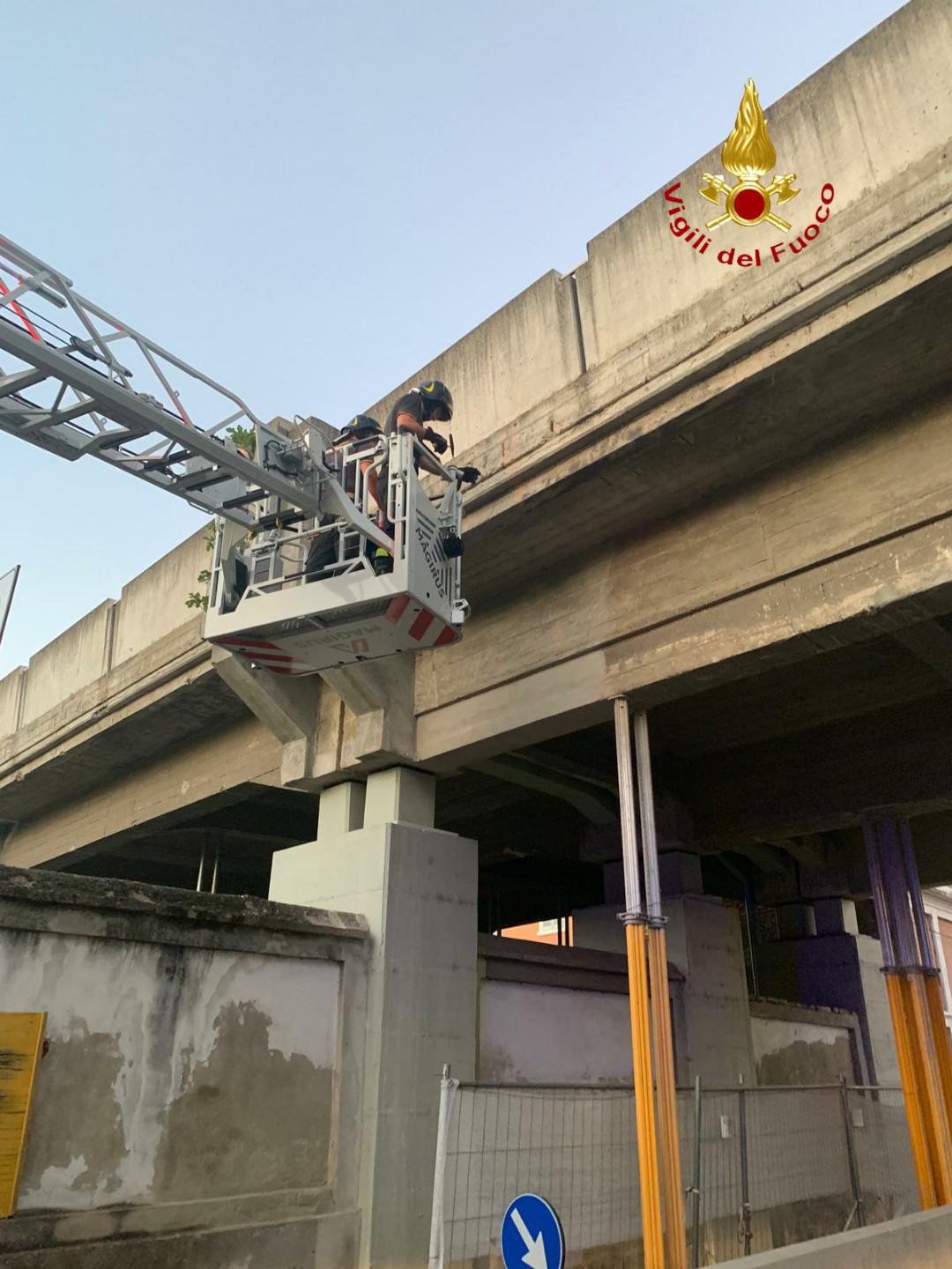 Cavalcaferrovia Belvedere: intervenuti i Vigili del Fuoco per distacco calcinacci. Intervento in via De Rossi dove il manufatto è pesantemente puntellato.
