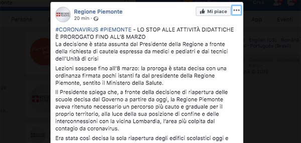 Lezioni ferme fino all’8 marzo in Piemonte. Lo si apprende dalla pagina Facebook di Regione Piemonte intorno alle ore 20 di lunedì 2 marzo. Già l’ordinanza che poneva martedì come scadenza per la decisione aveva lasciato intuire che si sarebbe fatto un passo indietro rispetto a quanto chiesto solo poche ore prima.