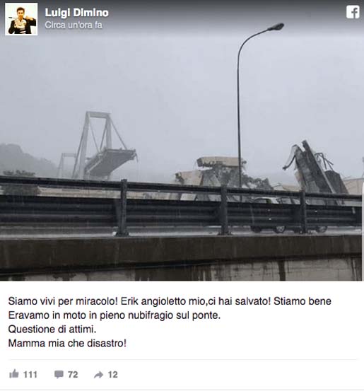 Crollo ponte Genova: musicista vercellese salvo per miracolo. E’ passato in moto durante il nubifragio poco prima del disastro.