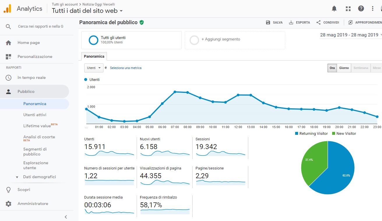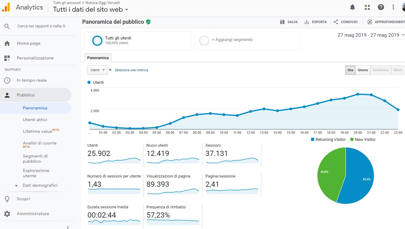 Secondo i dati di GOOGLE ANALYTICS lunedì 27 maggio 2019 il portale ha totalizzato 37.131 visite (sessioni), 25.902 visitatori unici e 89.393 visualizzazioni di pagina e una permanenza temporale media di 2 minuti e 44 secondi.