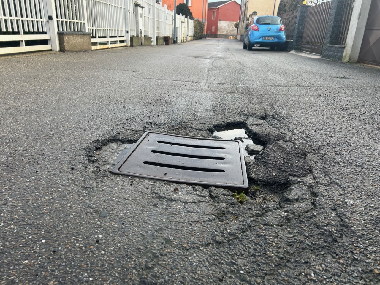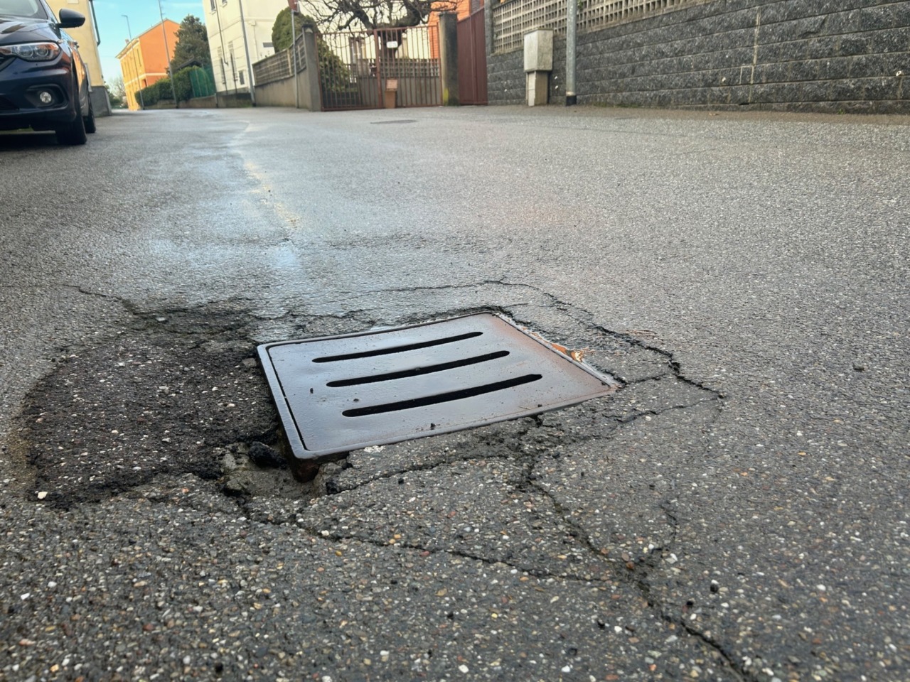 Buche al rione Cappuccini di Vercelli, 6 febbraio 2026, via Nazario Sauro (tombini voragine)