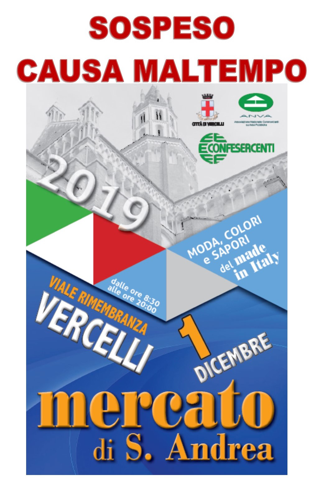 La Confesercenti comunica che il Mercato S. Andrea che doveva svolgersi domani in viale Rimembranza dalle 8,30 alle 20, domenica 1 dicembre 2019, causa maltempo, è stato sospeso.