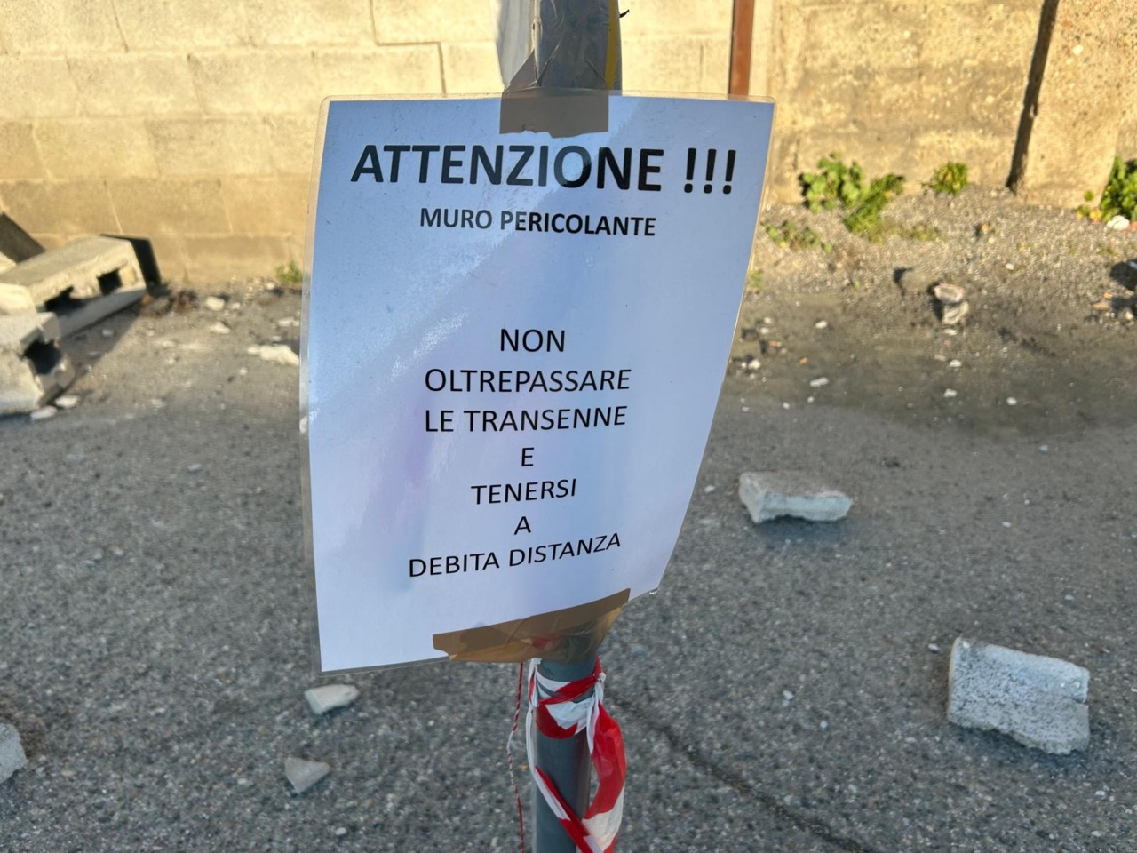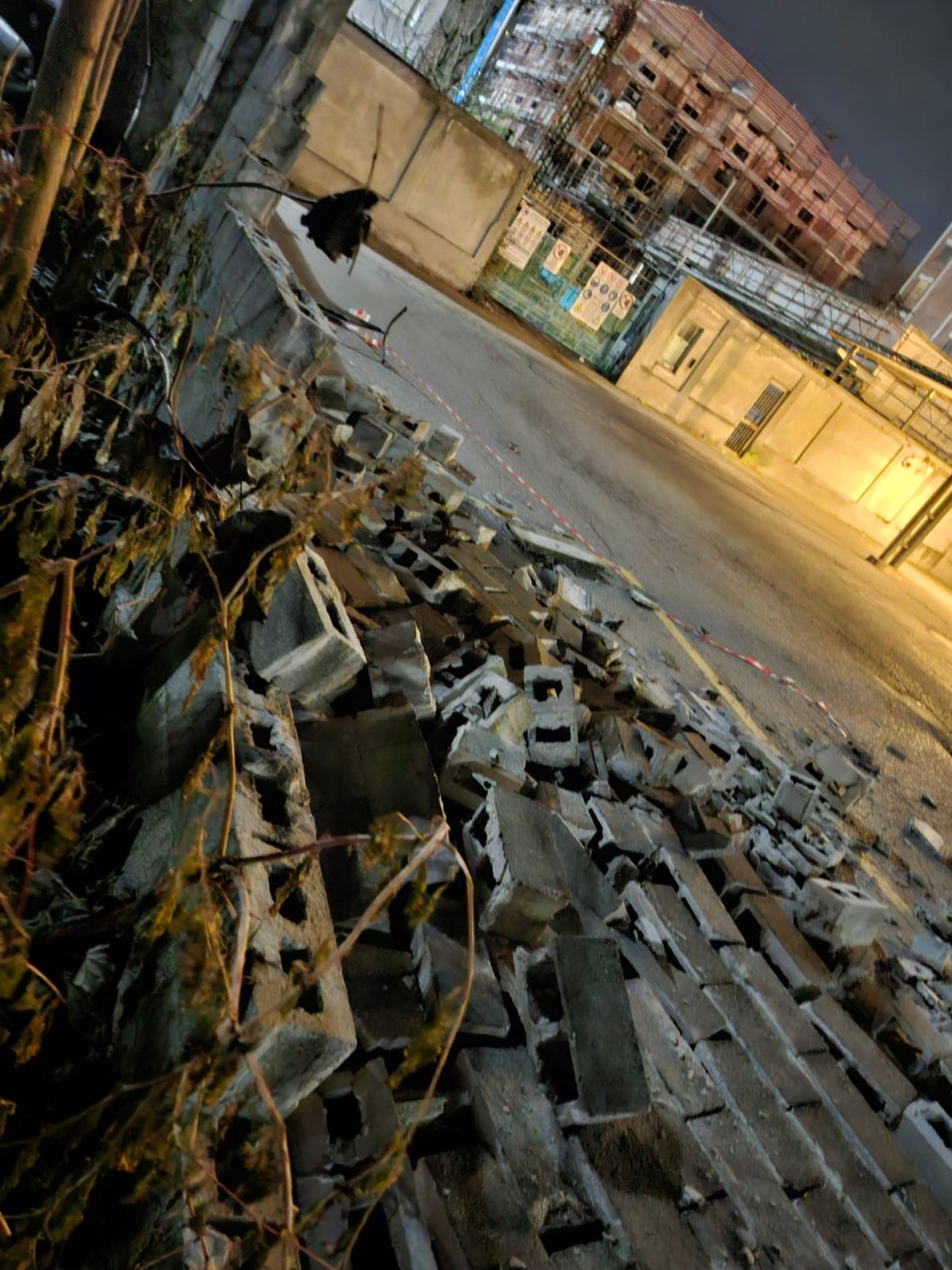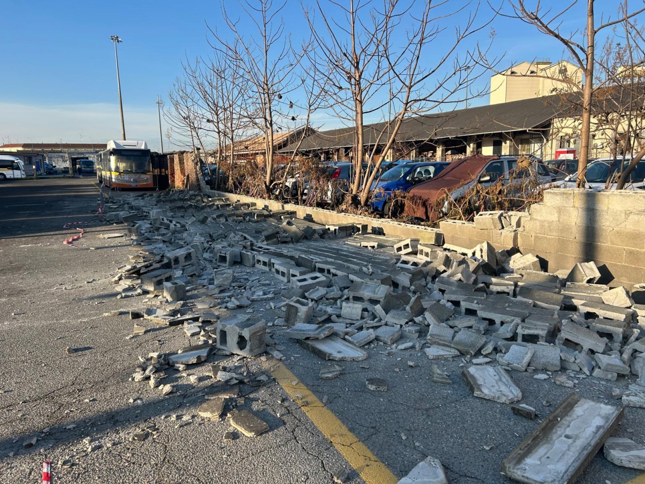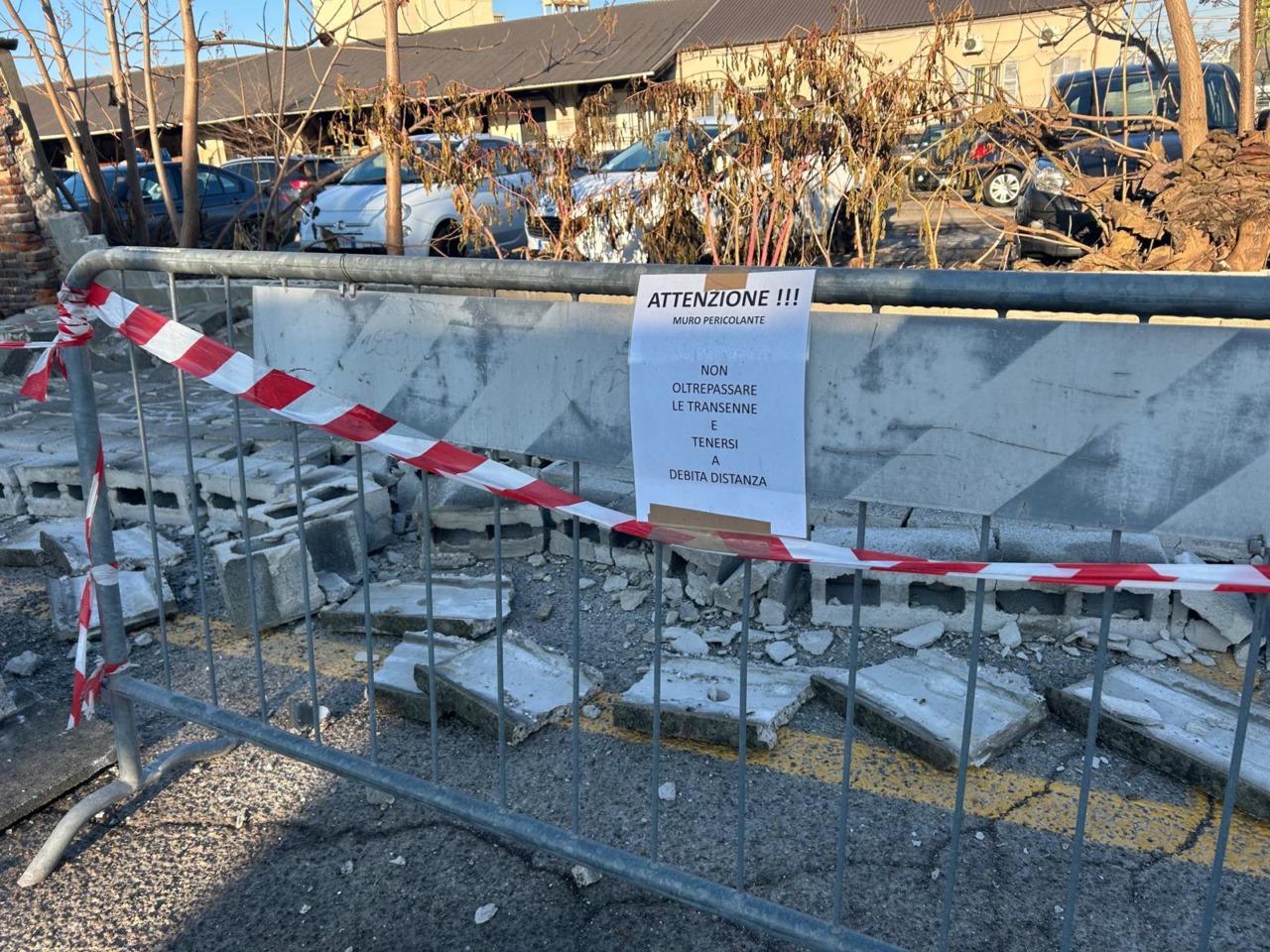 Risulta crollata una grande porzione di muro tra l’area della ferrovia e lo spiazzo di parcheggio dei pullman di ATAP.