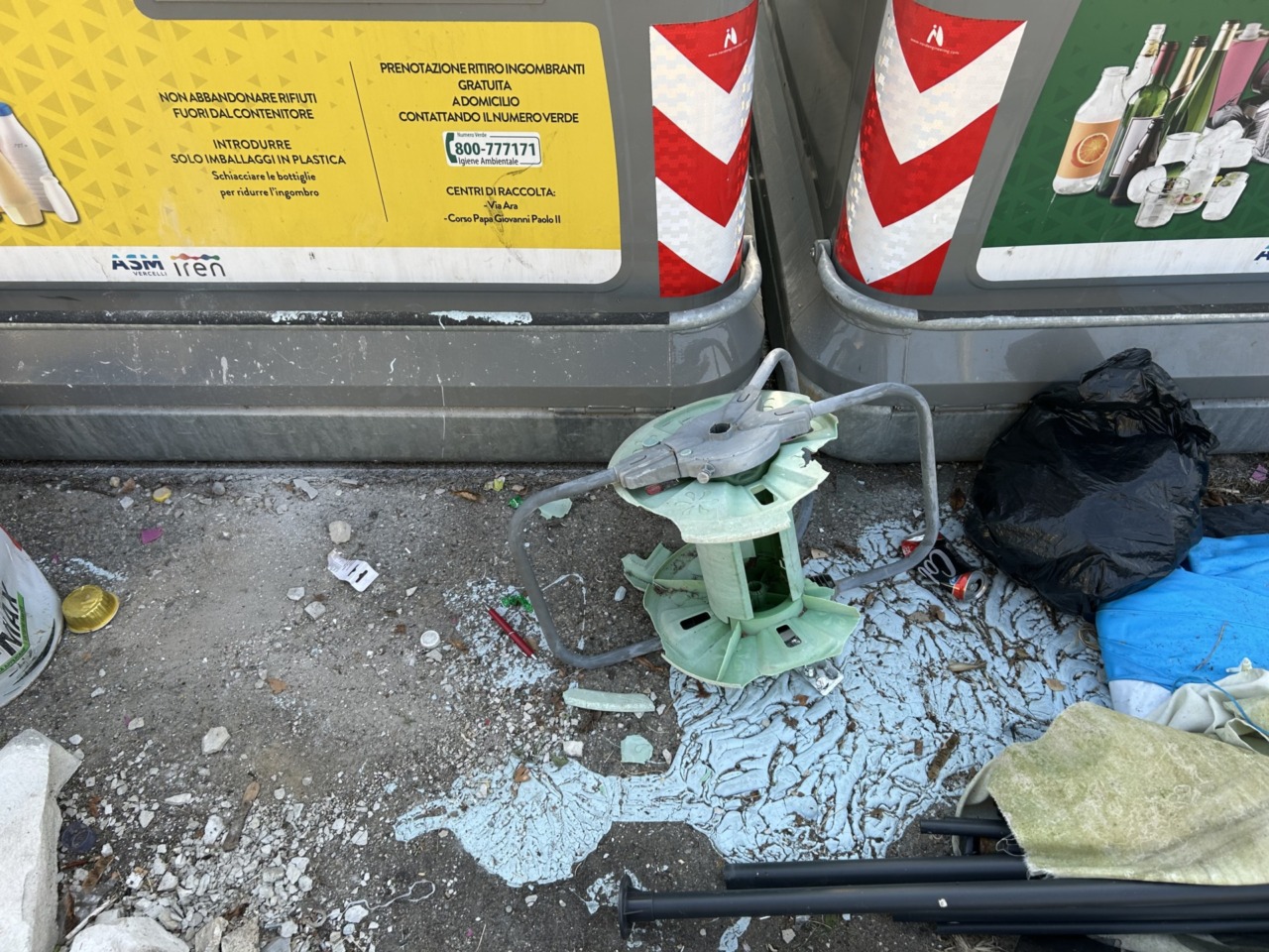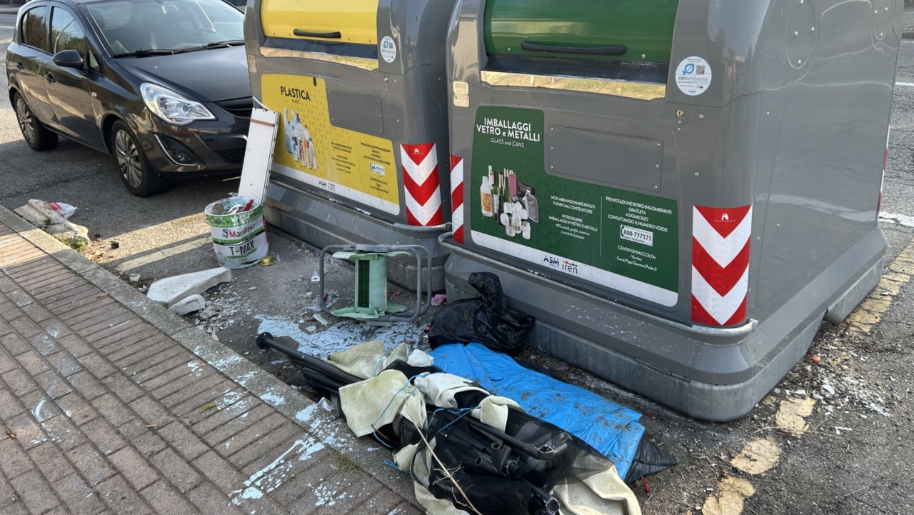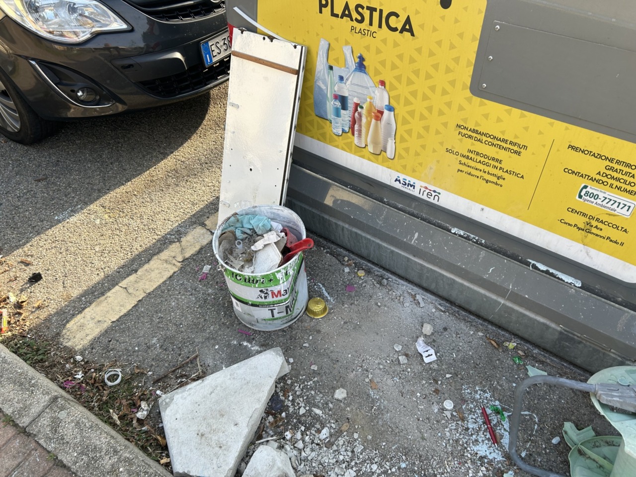 Qui, praticamente ogni giorno, c’è chi pensa bene di attorniare i cassonetti di scarti di opere edili: secchielli di vernice (peraltro sparsasi e crostificatasi a terra), vecchi attrezzi. E poi teloni e perfino un passeggino per bambini. Ed è incredibile pensare che, a soli cento metri da qui sia presente il centro multiraccolta in cui si può andare a scaricare gratuitamente e nella maniera corretta…
