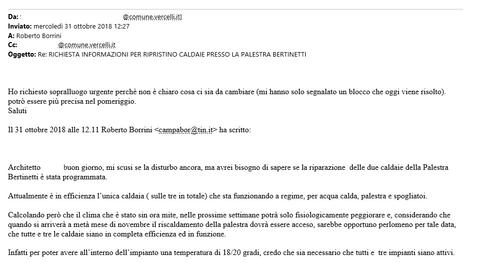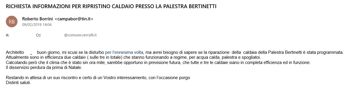 Il 09 Febbraio 2019 ho riscritto all’ufficio tecnico richiedendo informazioni sul ripristino della terza caldaia ( allego copia), ma da allora NESSUNO MI HA RISPOSTO.