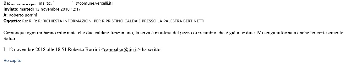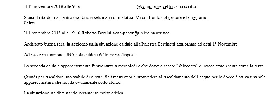 Dopo varie risposte tra la nostra Società e l’ufficio tecnico, di cui ho copia, ma non mi dilungo ad elencarle, il 13 novembre 2018 è stata ripristinata un’altra caldaia, mentre la terza da allora NON E’ MAI PIU’ STATA ATTIVATA, nonostante fosse necessario farlo, per evitare che due non sforzassero il loro lavoro ( vedi E Mail).