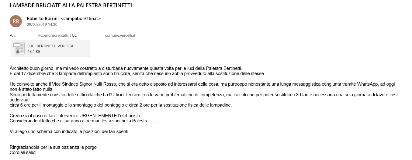 Visto che nulla era stato fatto, ma neppure preso in considerazione, ho inviato il 9 Febbraio una Email all’ufficio tecnico dove indicavo la criticità, informandolo che però non ero più in grado/intenzionato a sostituire a mie spese i tre fari spenti ( vedi EMAIL allegata).