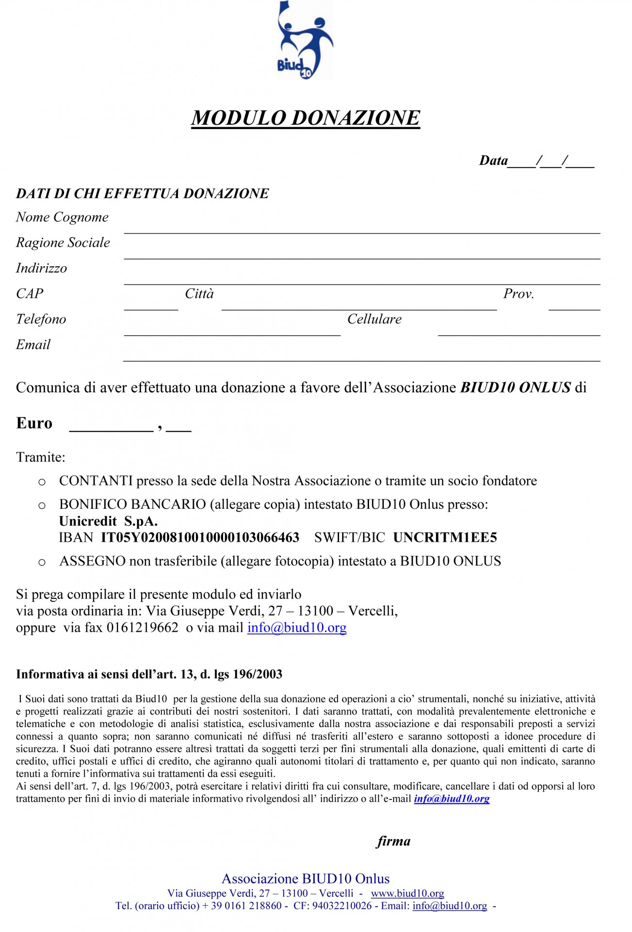 Qui il modulo da inviare compilato alla onlus che verrà restituito timbrato e firmato per ricevuta e per gli usi di legge.