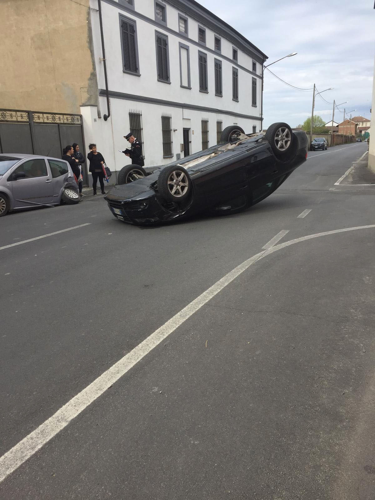 Tampona auto in sosta e si ribalta. A Trino nella mattinata di sabato 6 aprile 2019. Il conducente della autovettura non ha avuto gravi ferite, ma è stato accompato in ospedale per accertamenti.