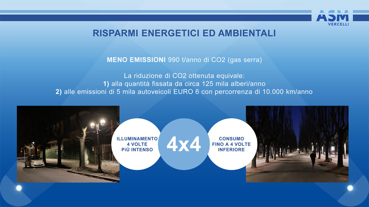 Secondo le stime di Asm si risparmieranno 2,411 milioni di kWh, pari a 990 tonnellate di CO 2 , equivalenti a circa 125 mila alberi/anno.