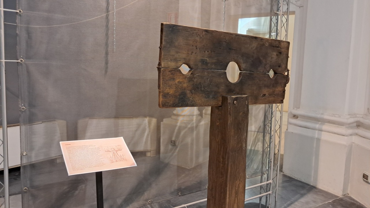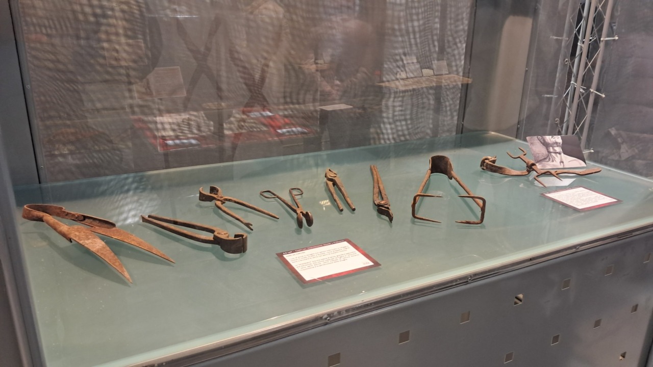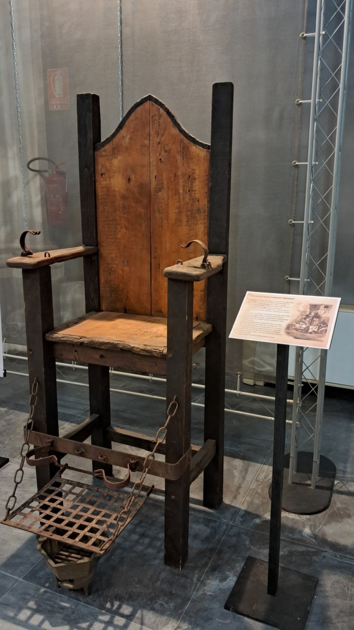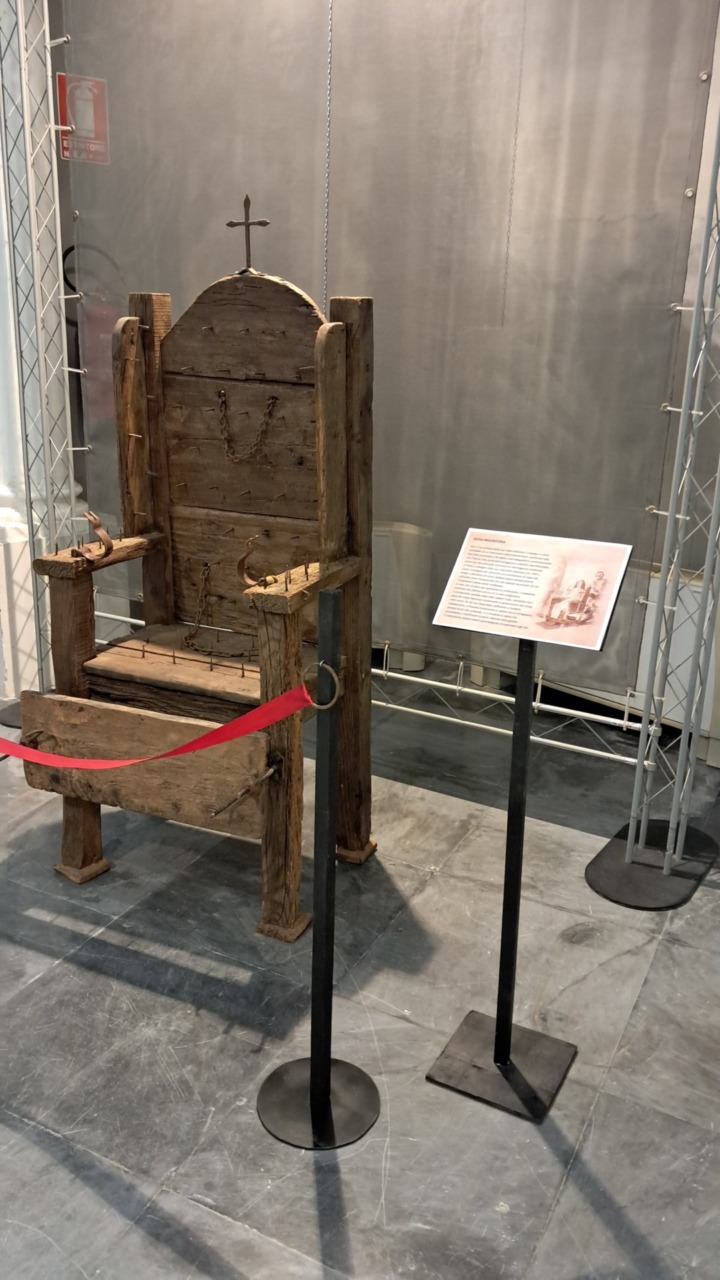 Altri strumenti di tortura sono disposti intorno. Solo la loro struttura lascia indovinare l’ultilizzo… Più di ogni spiegazione raccontano di supplizi atroci. In realtà l’Inquisizione alle nostre latitudini fu molto meno feroce, ma gli episodi non mancano nella nostra storia e sono qui ricordati.