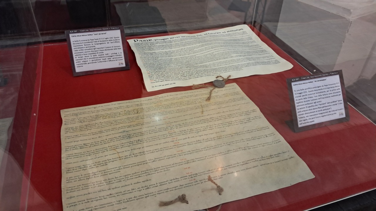 L’esposizione presenta riproduziobi di “bolle” e leggi legate al tema, oggetti di uso templare, comprese riproduzioni di armi. Il tutto è raccontato da sinossi specifiche e poi ci sono i volontari de “La Rete” prodighi di informazioni.