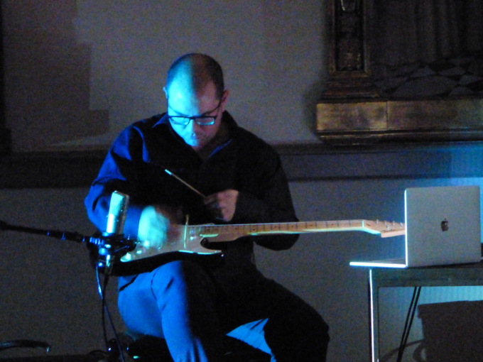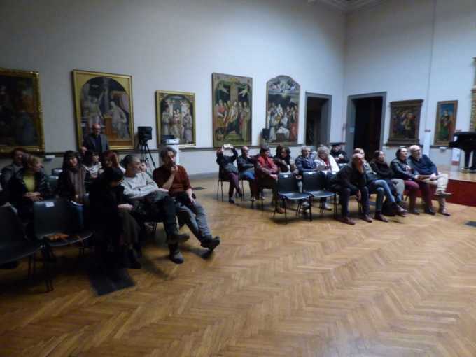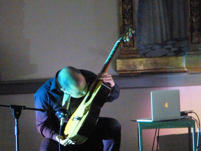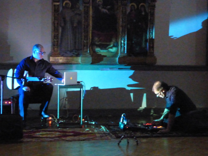 Sigurtà chino sulle strumentazioni elettroniche, con una concentrazione zen per far emergere suoni impossibili e Sorrentino a far fare alle chitarre (acustica per la fase “acqua” ed elettrica per la fase “terra”) incredibili evoluzioni, facendole diventare a tratti uno strumento diverso, hanno tenuto incollato il pubblico che ha seguito il concerto nel salone grande del Museo Borgogna, peraltro erano presenti quasi tutte le menti migliori della città, almeno in fatto di arte visiva, per dire quanto era attesa questa serata. Che anche se con una proposta molto sperimentale è stata anche fruibile in pieno dal pubblico.