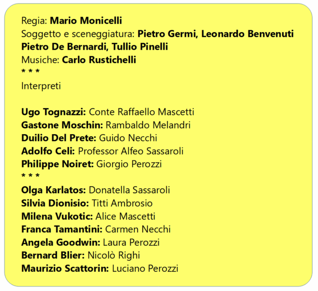 I rimedi per sfuggire alla noia da cui tutti cercano di liberarsi appaiono incomprensibilmente esagerati e smodati anche ad altri personaggi del racconto, come al figlio del giornalista o alla moglie del barista, persone dipinte come scialbe e mediocri, invero del tutto normali; ma l’originalità e l’abile realizzazione degli scherzi fa sì che l’eccesso delle azioni sia accettato e sacrificato dagli spettatori sull’altare della comicità. Ad un più attento esame però la lettura dei comportamenti di questi uomini, annoiati borghesi, rivela lo specchio di un intero sistema sociale materialista e consumistico, privo di valori e di obiettivi morali da raggiungere.  Momenti emblematici del film tuttora ricordati sono quando gli amici, per consolare dalle delusioni amorose l’architetto Melandri, vanno a schiaffeggiare i passeggeri che si sporgono dai finestrini di un treno già in movimento in partenza dalla stazione di Firenze; una scena subito divenuta un must della farsa, che sarà ripreso di lì a poco da Paolo Villaggio nel film Fantozzi, ma con esito fantozziano in quanto il treno risulterà in arrivo e non in partenza.  Altro momento iconico è la scena nella quale il conte Mascetti (Ugo Tognazzi) ha una diatriba con un vigile urbano e sciorina una catena di neologismi incomprensibili che hanno il culmine nella mitica “supercazzola con scappellamento a destra”. Rivisto ai giorni nostri il film appare percorrere una china patriarcale, le protagoniste donne sono marginali, adeguate alla trama ma mai centrali, sono mogli o amanti pretenziose, antipatiche, rigide o sciocche e servili, quando non puttane o semplici oggetti dal lato b interessante. Ma nonostante ciò la parte femminile ha il suo riscatto, opponendo assennata realtà all’egoistica e sconsiderata comicità della banda di amici. Il culmine della non considerazione della donna nei confronti della parte maschile avviene quando la moglie separata del Perozzi, nella stanza dove è composto il corpo del marito morto, vegliato dagli amici,  si chiede se la cosa sia vera o uno dei soliti scherzi. Vorrei citare infine una delle scene per me più coinvolgenti del film, dove troviamo il breve monologo che proprio il giornalista Perozzi recita da solo dalla finestra della sua camera da letto al cielo stellato, pochi istanti prima di essere colpito dall’infarto fatale: «Di nuovo le stelle, come le ho viste la notte scorsa e tante altre notti. Notti, giorni, amori, avvenimenti… Ho già sulle spalle un bel fardello di cose passate. E quelle future? Che sia per questo, per non sentire il peso di tutto questo, che continuo a prender nulla sul serio?»