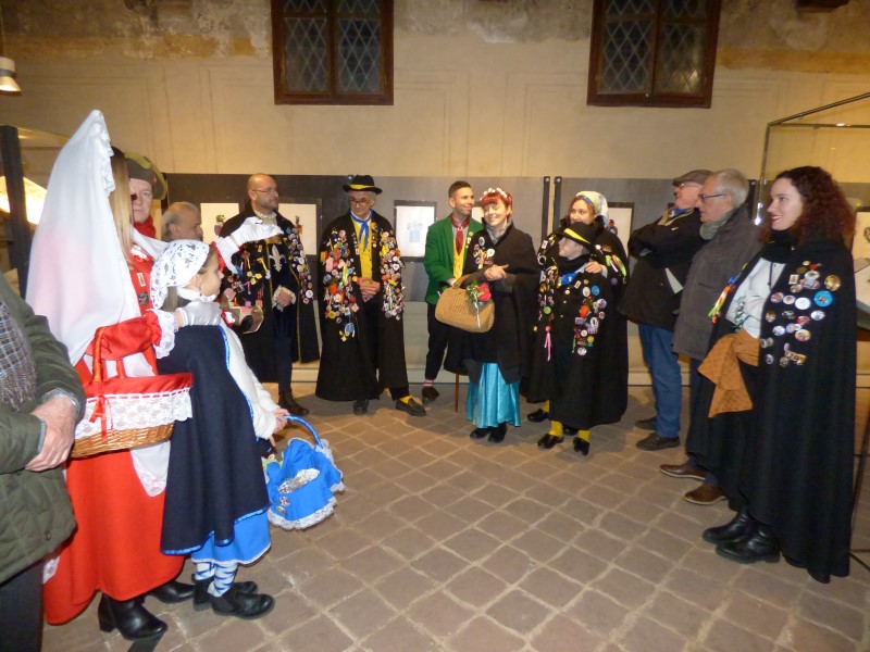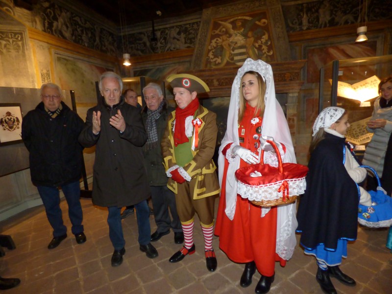 Il corteo mascherato è stato accolto dal presidente del Museo Gianni Mentigazzi e dal conservatore Luca Brusotto nella Sala d’Ercole dove è in corso la mostra legata alla donazione dei preziosi volumi di araldica “Statuts et Ordonnances du