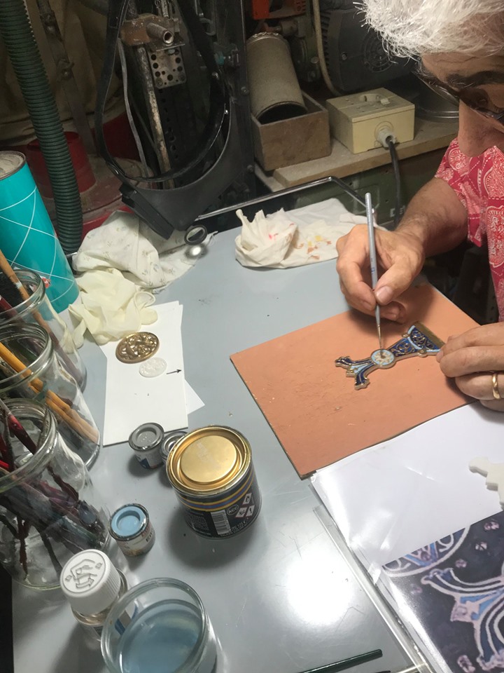 Nelle foto un dettaglio della copia del cofano e una fase della sua minuziosa realizzazione.