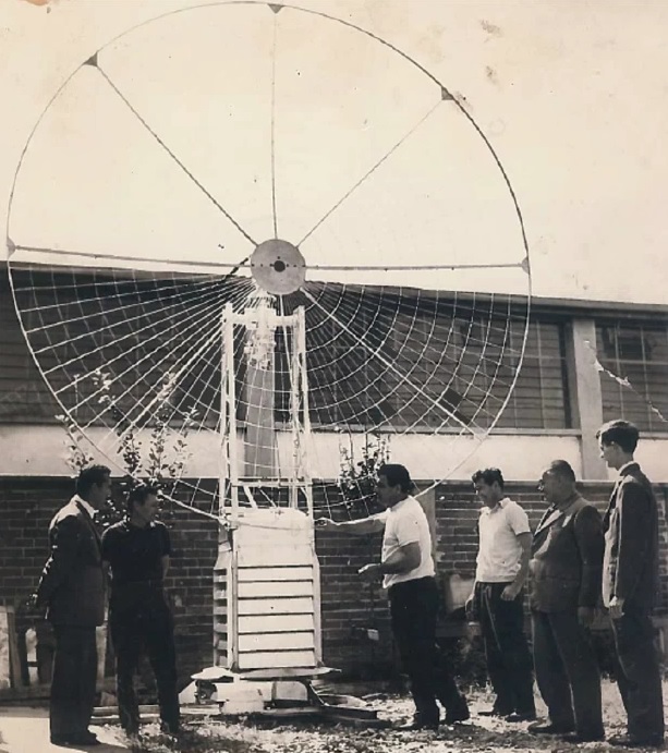 Nella foto la parabola nel giardino di casa Gaviglio. Da sinistra si notano: Fiore Marangoni e Pietro Cesari dell’officina Sagma, l’elettronico Ernesto Bellomo, Sergio Gaviglio, Nerino Gibin e Daniele Gaviglio.