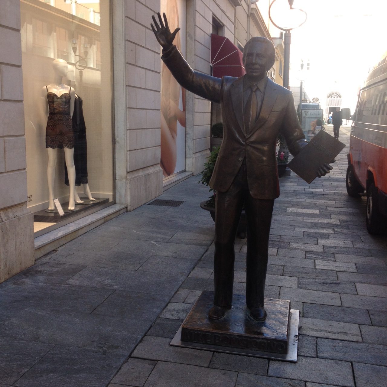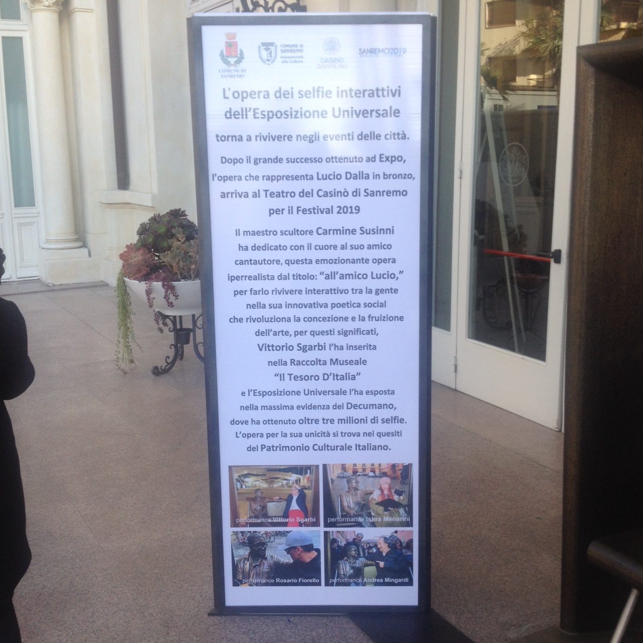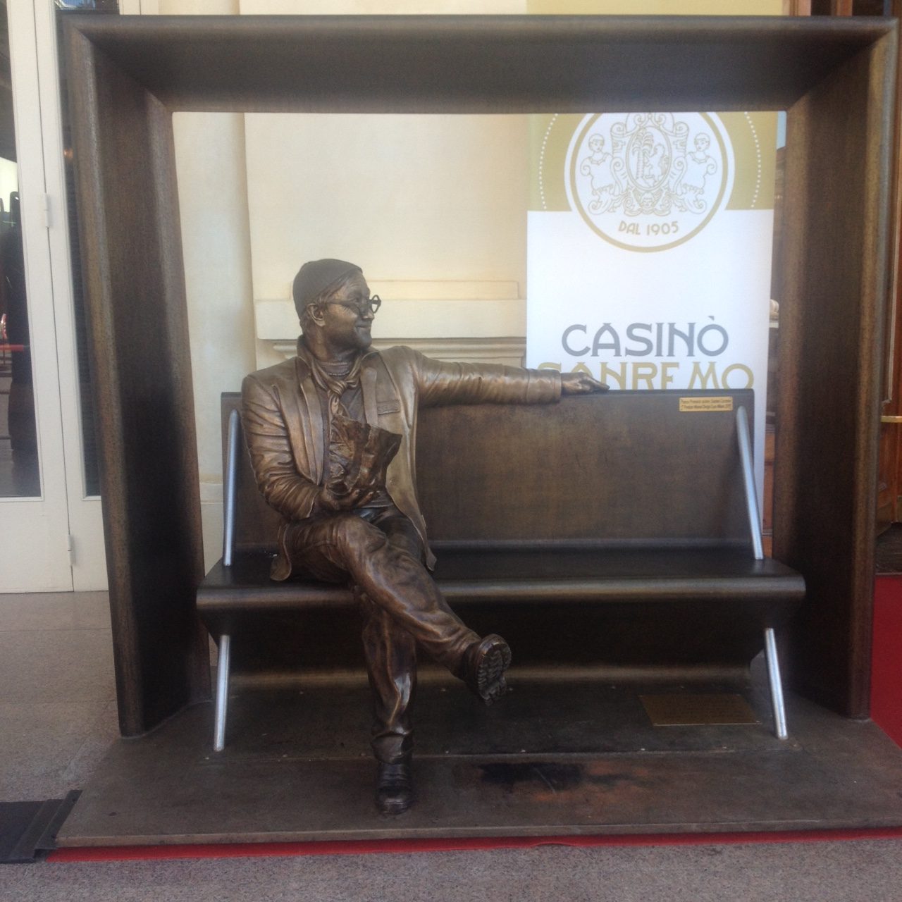 Oltre ai cartonati di cantanti e presentatori che da un paio d’anni per la verità invadono puntualmente la città ligure durante la kermesse festivaliera, ed oltre alla statua bronzea di Mike Bongiorno collocata a metà di corso Matteotti, ed inaugurata proprio in occasione del Sanremo 2013 (ad oggi sulla rete esistono oltre 5.300 video e fotografie in sua compagnia girati e postati su di una pagina dedicata!) quest’anno fa la sua apparizione anche la panchina – posizionata all’ingresso laterale del Casinò – con un bronzeo Lucio Dalla (sigh), simpaticamente seduto ed in posa, quasi a rappresentare una nuova forma d’arte che cerca popolarità e consensi attraverso la condivisione virale in rete o tramite smartphone.