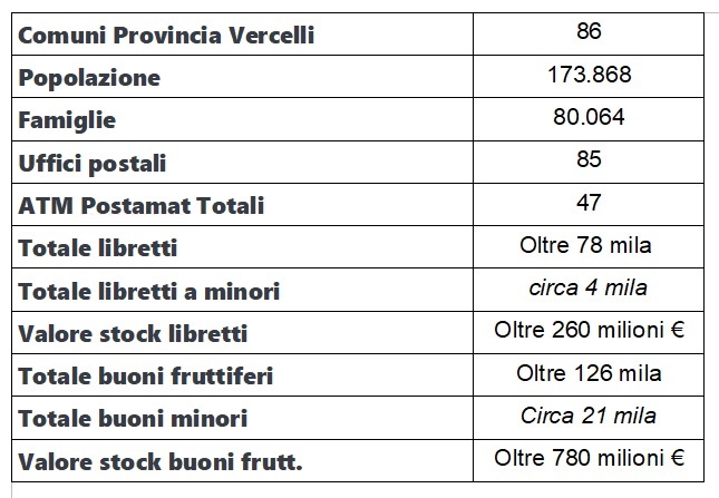 La provincia di Vercelli, che conta 86 comuni, partecipa in modo significativo a questa grande storia nazionale del risparmio e lo fa con un totale di 85 uffici presenti – in Piemonte sono 1.385 – a fronte di una popolazione che conta 173.868 abitanti.