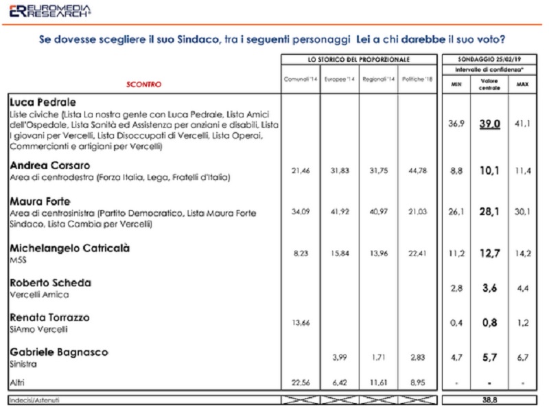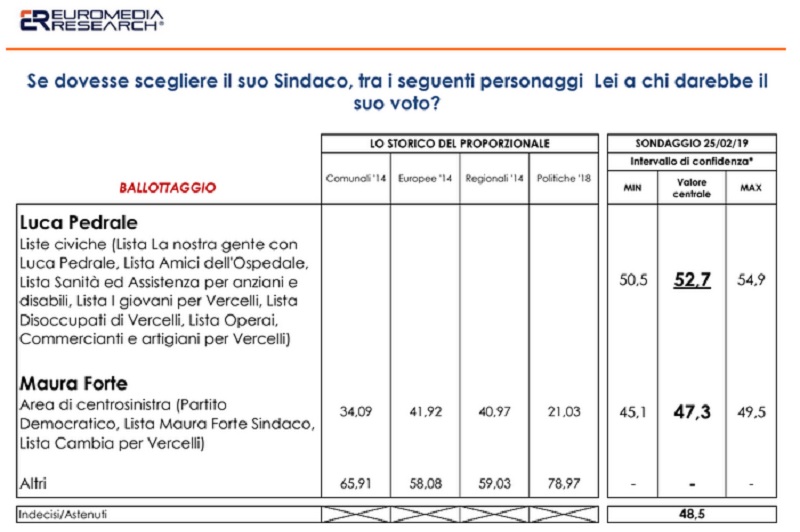 Per il decreto Legge 233/95 contestualmente alla pubblicazione dei dati vanno indicate le seguenti specifiche: Il committente del sondaggio è Luca Pedrale, la rilevazione è stata effettuata il 25 e 26 febbraio 2019, la popolazione di riferimento è di 36.639 cittadini maggiorenni residenti nel Comune di Vercelli. Il metodo di campionamento seguito è un campione casuale stratificato per quote e pari a 800 persone intervistate, metodo di raccolta dei dati Cati-Cami.