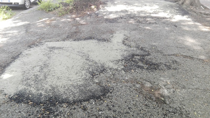 Catrame livellato in qualche maniera che lascia il tratto, percorso anche da molte persone anziane, al limite della percorrenza in sicurezza, radici parzialmente ricoperte dal catrame stesso, senza dimenticare che l’erba incolta non è nemmeno stata presa in considerazione.