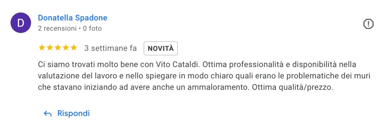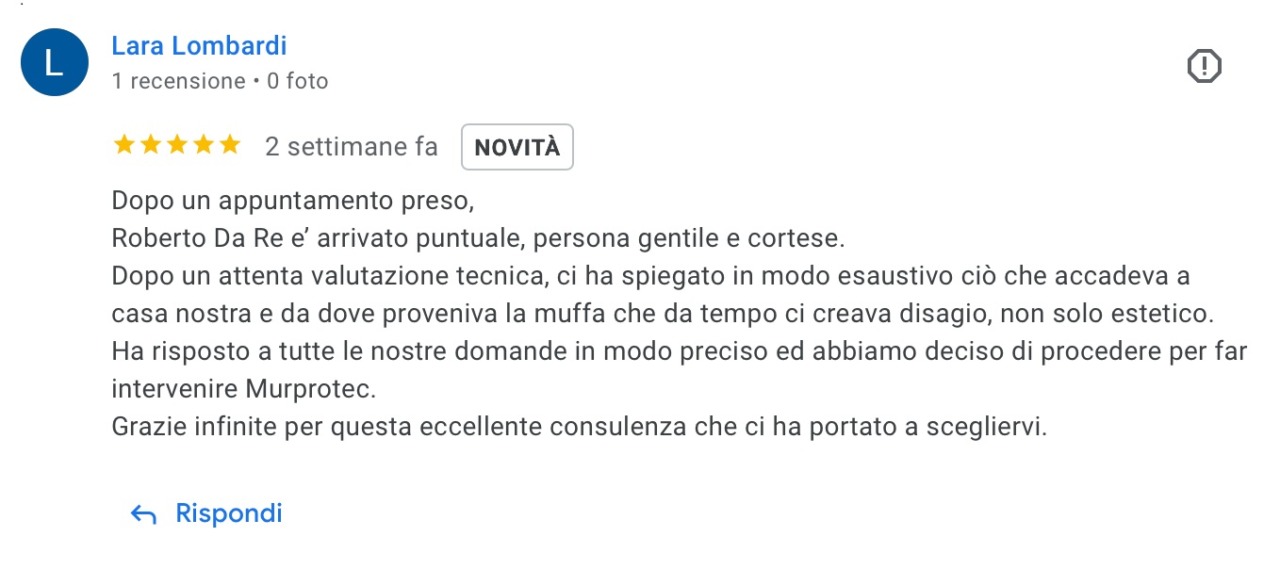 Murprotec non promette soluzioni temporanee, ma interventi definitivi e garantiti come evidenziato dalle recensioni sottostanti tratte da Google. Con una diagnosi gratuita e trattamenti mirati, Murprotec è la scelta giusta per chi vuole liberare la propria abitazione una volta per tutte dall’umidità.