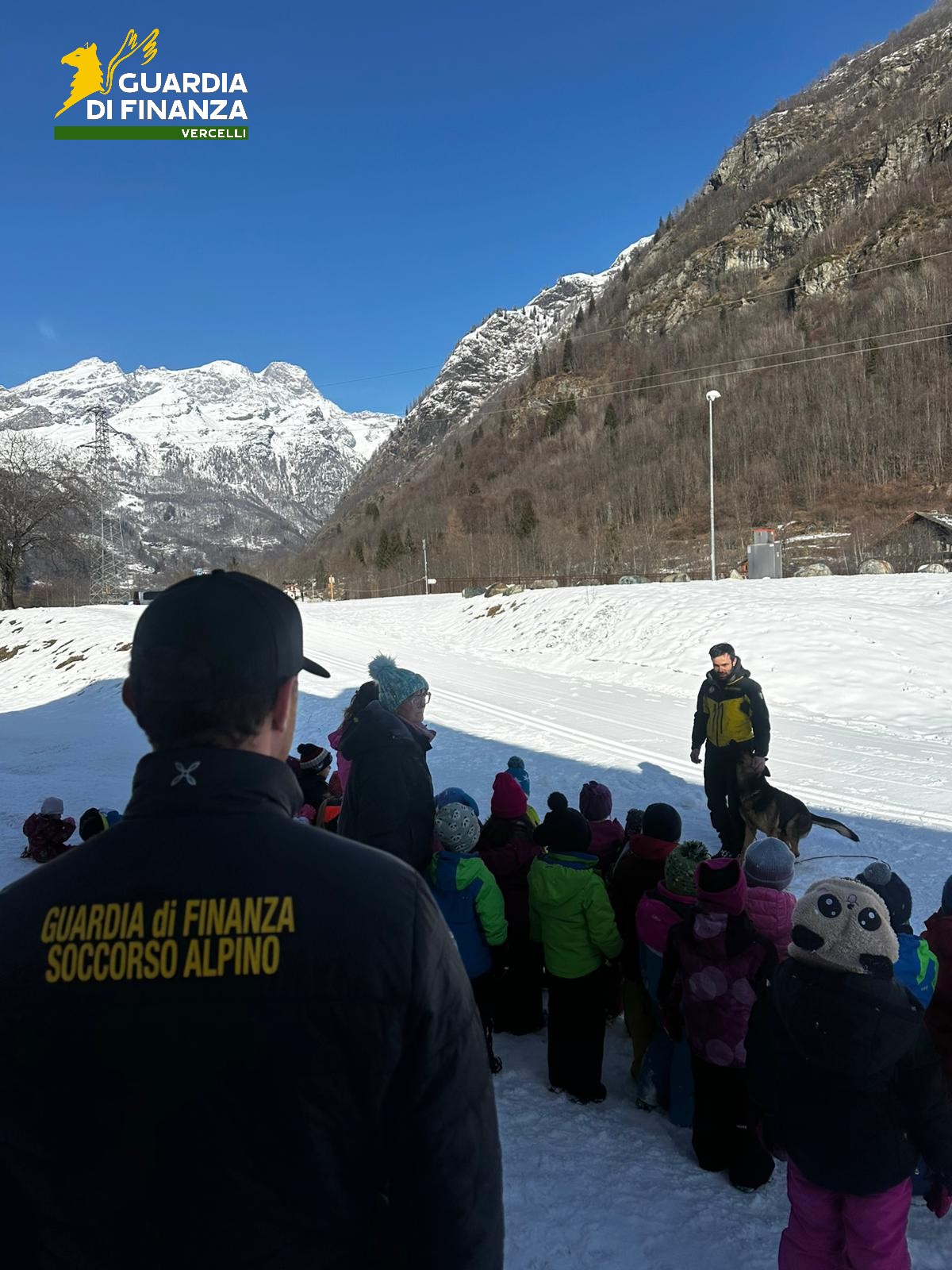 Nei giorni scorsi i militari della Stazione di Soccorso Alpino della Guardia di Finanza di Alagna Valsesia hanno incontrato gli alunni delle scuole Primarie di Quarona, Scopello e Varallo per illustrare le attività svolte in montangna per il soccorso, coinvolgendo i piccoli con l’aiuto di Kurz, uno dei tre cani da ricerca dei finanzieri vercellesi.