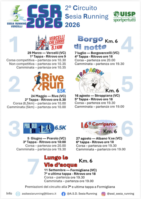 Un’eccellente notizia per gli appassionati di podismo: annunciata la seconda edizione del Circuito Sesia Running, organizzato dal sodalizio presieduto da Manuel Lucchini. Ci sarà un incremento delle tappe: da 5 a 7. E ce ne sarà per tutti i gusti. Sette gare per la bella stagione – a cominciare da fine marzo – e premiazioni al termine dell’ultimo appuntamento, in programma l’11 settembre. Si parte proprio da due novità assolute: il 29 marzo, 5 chilometri cittadini (5,1, per l’esattezza che varrà anche per il circuito Fidal) con la “Vercelli che corre“. Il 24 maggio si correrà tra le campagne di Rive lungo 8, 5 chilometri. Quindi, le «classiche» la Prarolo 12 Run passa da aprile al 5 giugno e verrà accorciata da 12 a 6 chilometri, poi la Borgo Vercelli di notte (7 luglio) di 6 chilometri, la Strapagiun a Stroppiana il 16 agosto, sempre sempre di 6 chilometri, proprio come la Corriparco di Albano Vercellese, in programma il 27 agosto.