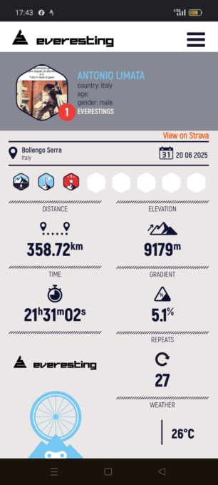 Il tronzanese Antonio Limata lo scorso sabato 21 giugno, sulla salita della Serra fra Bollengo e Magnano ha condotto un Everesting, cimento ciclistico che comporta di coprire un dislivello pari all’altezza del monte Everest. Un’impresa nel senso letterale del termine, perché nelle ultime due ore Antonio ha pedalato sotto pioggia, grandine e vento e un calo termico repentino di oltre 20 °C.