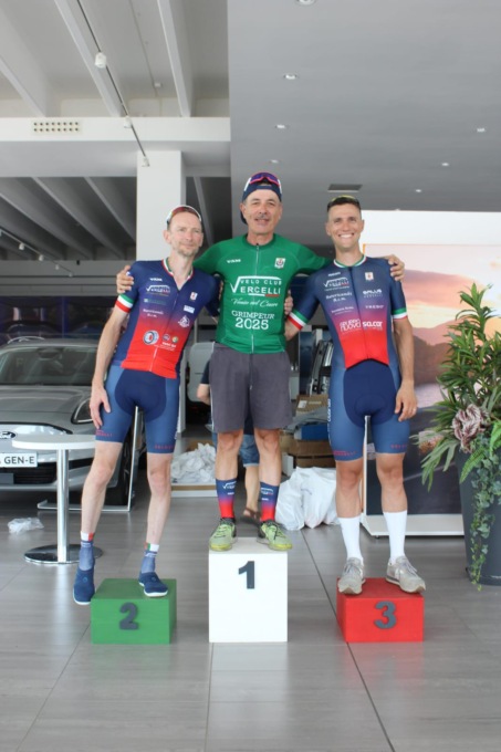 A tagliare per primo il traguardo è stato il Biellese Michel Chocol, della società Penta Bike, davanti ad Andrea Tombolato, 3° Lorenzo Alladio. Tra le donne vittoria di Silvia Milone (Sanetti Sport). Per il Velo Club il primo ad arrivare è stato Max Bussa, 11° assoluto e 3° di categoria, che ha preceduto di 10 secondi Gabriele Schianta, 12° e 2° tra i gentleman A, quindi Nicolò Boltri 15° e 4° tra i Senior B. Questi tre nomi compongono il podio sociale del miglior scalatore 2025 del Velo Club; per Bussa la riconferma della maglia verde dopo la vittoria del 2024. Nei primi 20 assoluti anche Andrea La Spisa, 17° (5° Senior B). Ottimamente piazzati Muraro (21° ass/5° cat.), Bosso (24° ass/3° cat.), Vella (25° ass/6° cat.), Bello (28° ass./3° cat.), Salvini, Cabiale, Viola (2° nei Senior A), Greco (1° nei Supergentleman B), Bachini, Sanzone e Ubertino. La società vercellese si è imposta nella classifica a squadre, ma come da consuetudine ha ceduto da società ospitante il trofeo alla 2° classificata, il Penta Bike, a seguire Ciclosport Casale, Myg Team e Bike Training. All’arrivo a Caresanablot è stata offerta a tutti come ristoro finale la panissa vercellese preparata da Guido Manolli. Prima della partenza era stato osservato un minuto di silenzio in memoria di Venio Trebaldi, presidente del Velo, a pochi giorni dell’anniversario della scomparsa un anno fa. Per i ragazzi del Velo Club è stato un ricordo molto sentito in quanto l’edizione 2024 del Trofeo Nuova Sa-Car è stata l’ultima uscita pubblica e l’ultima vittoria dello storico Patron.