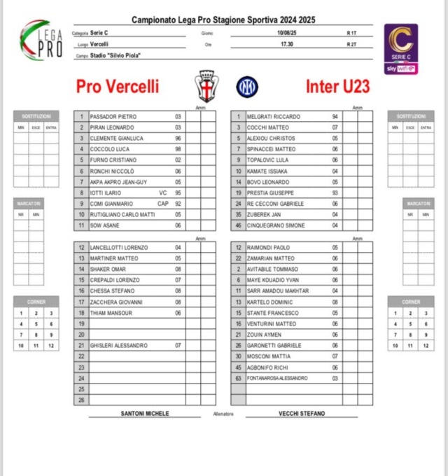 Non inganni il risultato: la batosta c’è stata, in termini numerici, ma a lunghi tratti la Pro dalle carte rimescolate, ha saputo offrire una proposta calcistica addirittura migliore a quella dei giovani nerazzurri, che hanno per contro fatto maggior affidamento sulla fisicità. E su un arbitraggio parecchio scadente, con quel rigore dello 0-2 totalmente inventato (trasformato da Kamate, dopo l’acuto poco prima di Cinquegrano) e che ha chiuso il primo tempo. Sempre su penalty è arrivato il momentaneo 1-2 in contropiede di Gianmario Comi. Quindi, dopo aver sfiorato il pari in un paio di circostanze, nel finale sono arrivate le reti nerazzurre con la deviazione al volo di Topalovic e la rete in contropiede di Mosconi. Parecchi dubbi, in casa Pro Vercelli, li ha lasciati la coppia di centrali difensivi (nel 4-3-3 di Santoni) Clemente-Coccolo, particolarmente statica e sulle gambe, molto probabilmente diretta conseguenza della preparazione estiva. Molto bene, invece, Jean-Guy Akpa Akpro, dotato di dribbling, estro e fisicità lungo la fascia, pedina che tornerà certamente utile. Nota bene: sullo 0-0, infortunio per il portiere leonino Pietro Passador, costretto a dare anzitempo forfait. Sabato 16 agosto si comincerà a fare sul serio: a Zanica, alle 18, primo turno (in gara secca) di Coppa Italia di Serie C contro l’Albinoleffe. Tutto questo in attesa di altri (inevitabili) colpi di calciomercato, che sta arrivando alla sua fase conclusiva.
