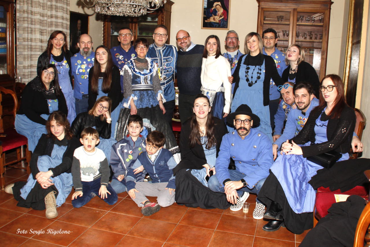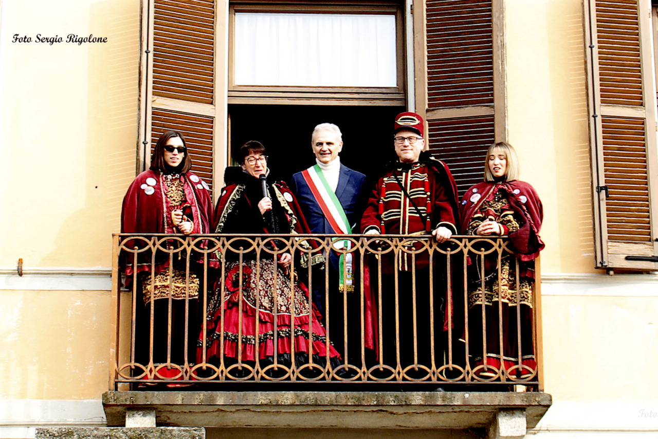 Nelle foto di Sergio Rigolone il gruppo alla bicchierata e le maschere col sindaco dal balcone del municipio.