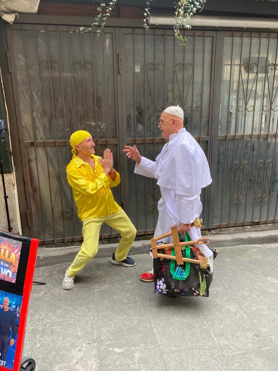 Gente in costume medievale, persone abbigliate da Papa, da cardinale, da antico romano, senza nessun nesso logico con l’ambiente e la manifestazione circostante.